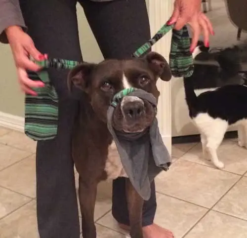 Solution: A homemade muzzle — Most owners of easy-going pets don't even own a muzzle, so if you ever find it necessary to prevent your dog (or even your cat) from biting out of fear or pain, you can quickly improvise a muzzle from a pair of hose or tights, a man's tie, or any available strip of cloth. The make-shift muzzle is lightly looped over your pet's nose and mouth, then crossed under the chin, and tied behind the ears.
