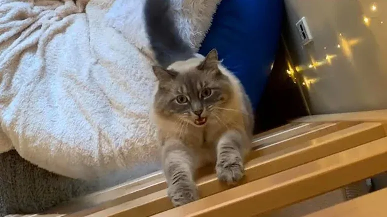 Daphne loves snuggling with her owner’s boyfriend and exploring a makeshift jungle gym. This cat brings comfort and joy daily, transforming dorm life into a heartwarming adventure and making a little piece of Kansas feel like home.